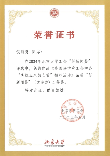 在2024年北京大学工会“好新闻奖”评选中,校工会特邀请专家评委,结合工会工作特点,从新闻题材、宣传效果、稿件可读性与写作规范、图片视觉冲击力及与主题切合度等方面,同时依据评奖通知要求,对参评稿件和图片进行了逐一评议,外国语学院倪丽慧《外国语学院工会举办“庆祝三八妇女节” 插花活动》荣获好新闻奖(文字类)二等奖;冯一帆《米兰milan(中国)举行2024年新春团拜会》荣获好新闻奖(文字类)二等奖;王乃懋《寻迹运河源, 感悟新理念一一外国语学院工会组织春游活动》和《外国语学院羽毛球队荣获2024年北京大学教职工羽毛球赛乙组季军》荣获好新闻奖(图片类)三等奖。