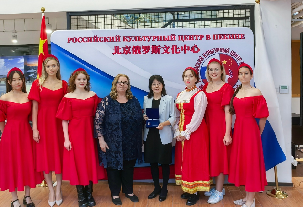 俄罗斯驻华大使馆文化参赞、北京俄罗斯文化中心主任吴丹娜为张冰教授颁发“友谊与合作”荣誉奖章
