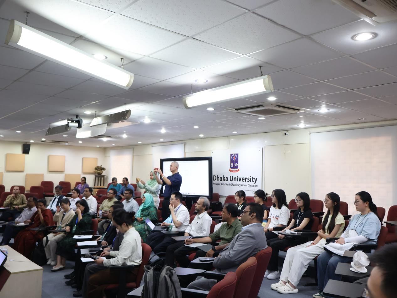 8月11日上午,调研团访问孟加拉国达卡大学(Dhaka University),共同举办"数智时代的高等教育与“一带一路”合作:北京大学-达卡大学对话"研讨会。王旭发表《以人民为中心的经济发展与国家安全:中国经验对孟加拉国的启示》专题报告,吴杰伟分享题为《全球化时代的劳动力动态比较研究:以孟加拉国、越南和菲律宾为例》的报告。现场学术气氛热烈,与会学者就相关议题展开深度讨论。